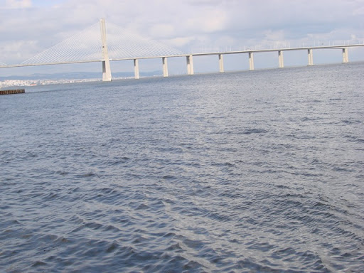 Horft af sýningarsvæðinu að brú yfir tesjuána og brúin heitir Vasco de Gama.