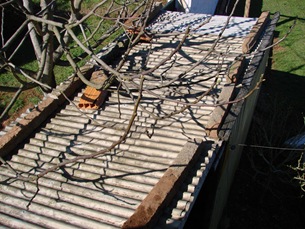 Það hvessti hér í gær undir kvöld og var hvasst á okkar mælikvarða hér í alla nótt og fram á morgunn. Rafmagnslínur hér eru greinilega ekki hannaðar fyrir svona vind, því rafmagnir fór margsinnis af í gærkvöldi og eitthvað hefur verið rafmagnslaust í nótt. Í Austurkoti fuku nokkrar þakplötur af skýli sem upphaflega var gert til að hýsa brenni en er nú notað til að geima í hjólbörur, tætara og annað sem viðkemur garðinum. Sem betur fór fuku plöturnar ekki langt og eru nú aftur komnar á sinn stað og til öryggis búið að fergja þær með grjóti. Það eru til hérna granítstólpar sem notaðir voru til að styðja við vínviðinn, en hafa ekki haft neinu hlutverki að gegna síðan ég settist að hér, því ekki er ég að rækta vín, svo það er gott að finna þeim nýtt hlutverk, en ég verð að játa að það var nokkuð strembið fyrir mig að koma þeirri þyngstu þeirra á sinn stað.
